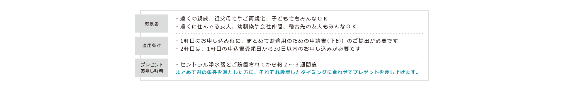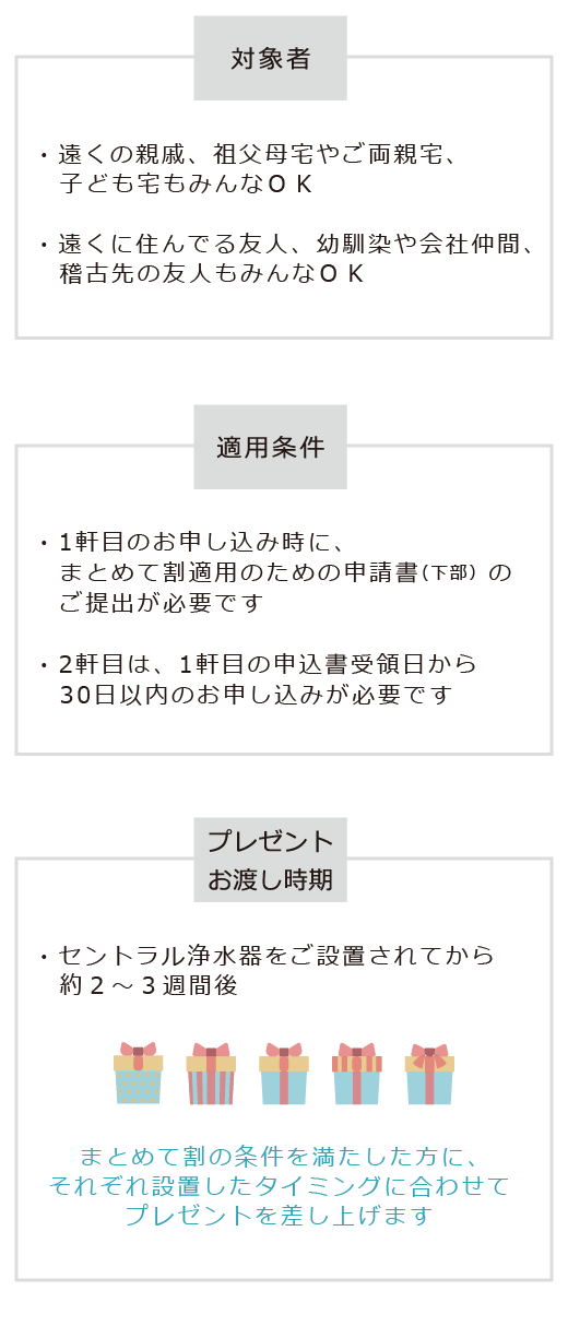 それぞれセントラル浄水器を設置したタイミングに合わせて(ご設置されてから約2~3週間後)、プレゼントを差し上げます。