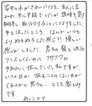"家中の水がきれいになる”主人に言われ半信半疑でしたが、説明を受け納得し取付けることになりました。手を洗ったところ、なんかいつもよりぬるぬるした感じ?!優しい感じがしました。息子の髪を洗うリンスしないのにフワフワ?手あれに悩んでいた私ですが、いつの日か悩むことのない日が来るかと思うと、、、楽しみです。